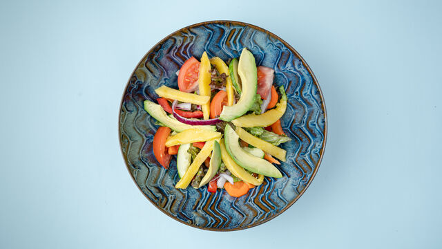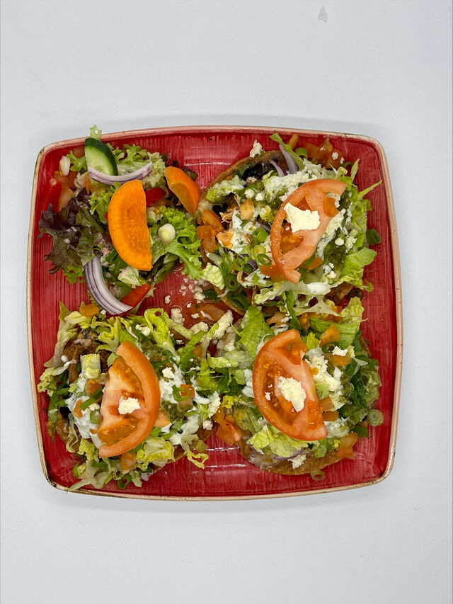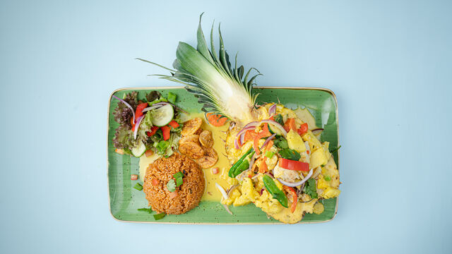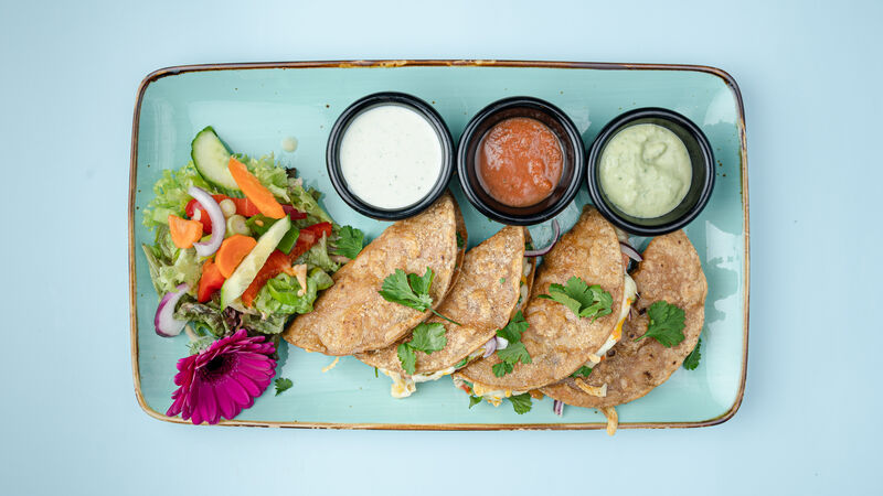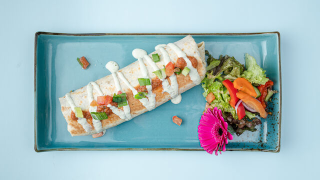 Karibische und mexikanische Speisen sowie Cocktails in einem gemütlichen, farbenfrohen Restaurant mit Terrasse.